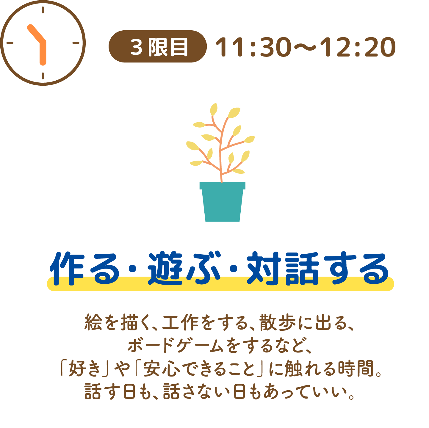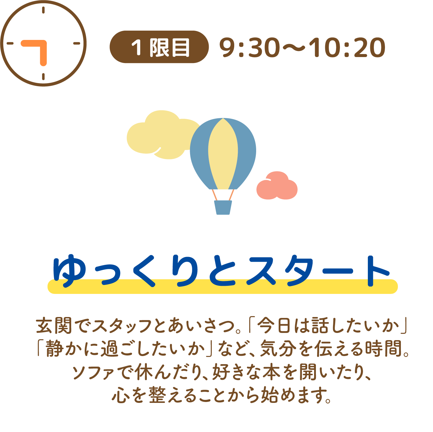 学習、創作活動、軽い運動、対話の時間などを組み合わせています。決まった時間割に縛られすぎず、その日の体調や気持ちに合わせて過ごせます。