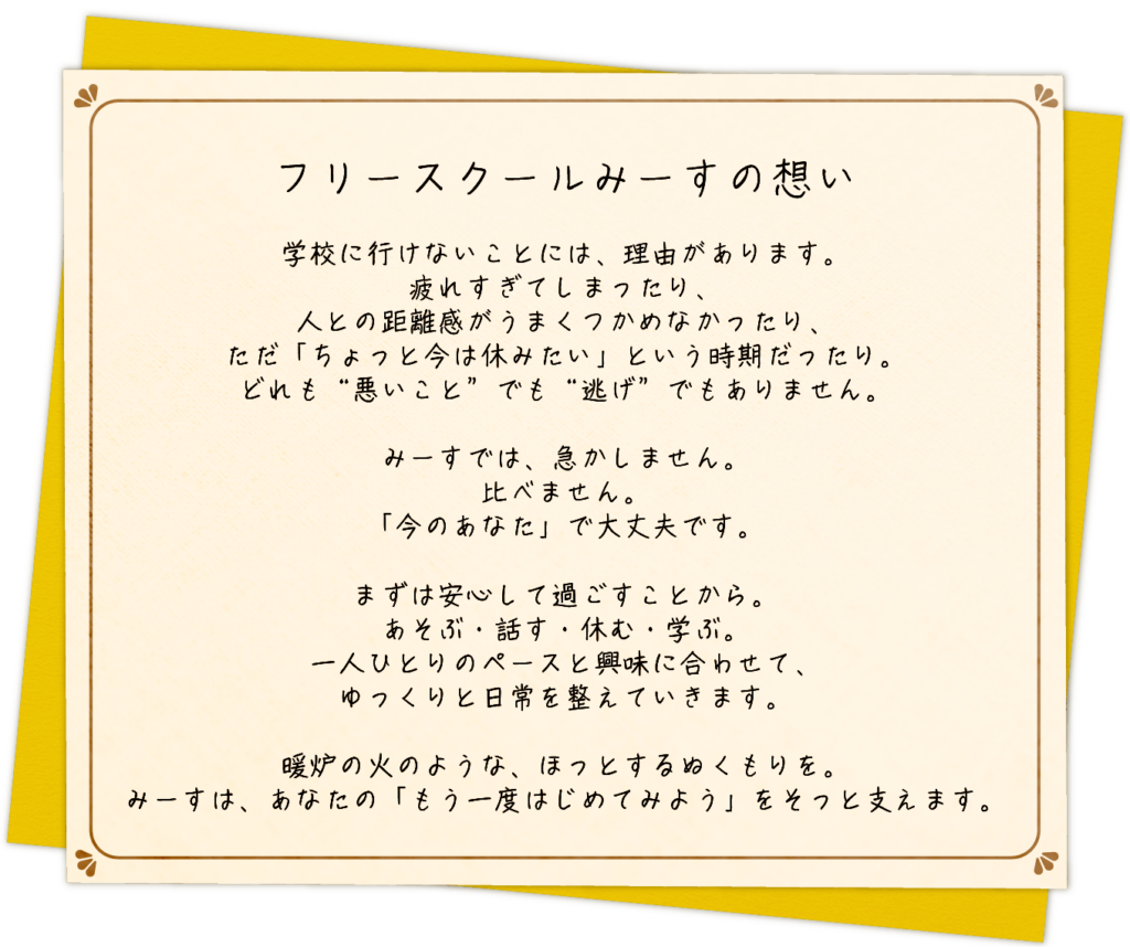学校に行きづらさを感じている子どもたちが、安心して過ごし、学び、社会とつながるための居場所です。学年や成績にとらわれず、一人ひとりのペースを大切にしています。